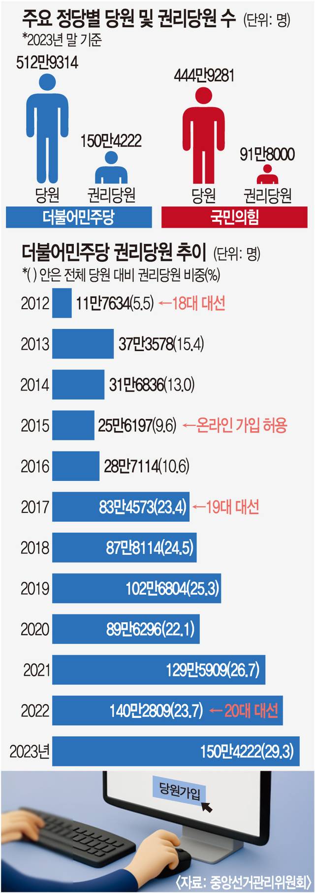 13일 중앙선거관리위원회가 발간한 ‘2023년도 정당의 활동 개황 및 회계 보고’에 따르면 더불어민주당 당원 수는 512만9314명으로 국민의힘(444만9281명)보다 68만33명 많다. 정의당 등 다른 정당을 합하면 한국 정당 당원 수는 1120만1374명으로, 18세 이상 국민 4명 중 1명은 특정 정당의 당원이다.