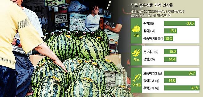 13일 한국농수산식품유통공사(aT)의 가격정보를 보면, 일부 농·축·수산물의 소비자가격은 올해 상반기 통계청의 소비자물가(전년 동월 대비 2.1% 상승)를 상회하는 두자릿수 이상의 상승세를 보이고 있다. 11일 기준 수박 1통은 평균 2만9115원으로 3만원에 가깝게 거래됐다. 전년(2만1336원) 대비 36.5% 상승했고, 일주일 전인 4일(2만3763원)과 비교해도 22.5%나 오른 가격이다. 지난달 장마 등에 따른 일조량 부족으로 생육이 늦어진 상황에서 예년보다 일찍 찾아온 폭염으로 수요는 늘었기 때문이다. 대체재인 참외값(10개 1만6168원)도 지난달보단 16.4% 낮지만 1년 전에 견주면 15.1% 올랐다. 기온이 오르면서 병해충이 증가해 면적당 생산량이 감소한 여파다. 복숭아(백도 10개)와 멜론(1개)도 각각 2만3097원, 1만76원으로 전년 대비 각각 10.3%, 21.7% 높은 가격에 판매됐다.