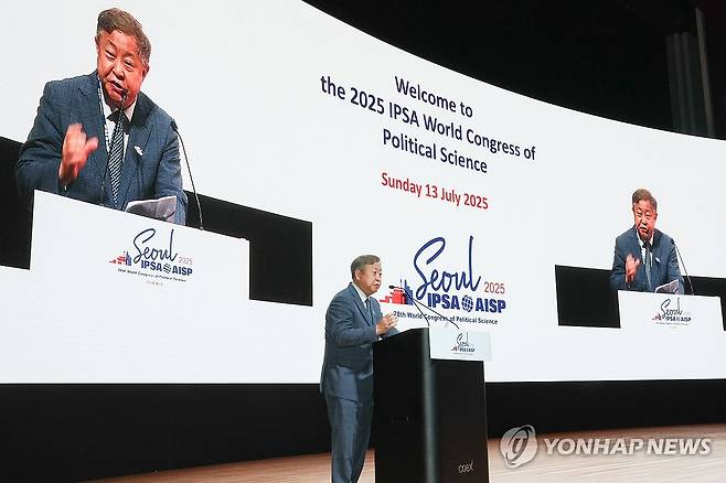 (서울=연합뉴스) 홍해인 기자 = 세계정치학회 서울총회 조직위원장인 김의영 서울대 교수가 13일 서울 강남구 코엑스에서 열린 2025 세계정치학회(IPSA) 서울총회 개막식에서 환영사를 하고 있다. 2025.7.13 [대통령실통신사진기자단]