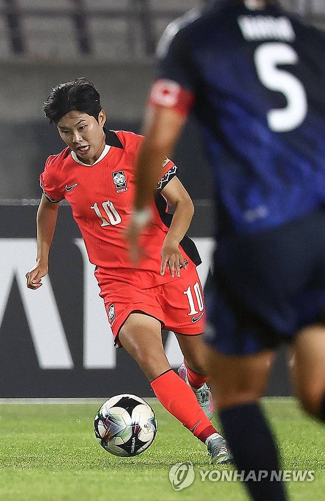(화성=연합뉴스) 김성민 기자 = 13일 경기도 화성종합경기타운 주경기장에서 열린 2025년 동아시아축구연맹(EAFF) E-1 챔피언십(동아시안컵) 여자부 대한민국과 일본의 경기. 한국 지소연이 드리블하고 있다. 2025.7.13