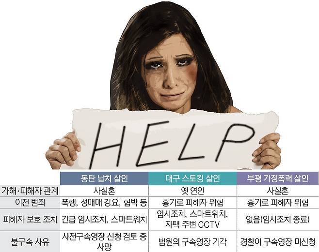 국민을 충격에 빠뜨린 동탄 납치 살인, 대구 스토킹 살인, 부평 가정폭력 살인. 세 사건의 공통점은 가해자가 앞서 폭행과 스토킹, 협박 등 범죄로 경찰 조사를 받았다가 살인을 저질렀다는 점이다. 이들은 모두 ‘불구속’ 수사를 받고 있어 마음만 먹으면 언제든 피해자에게 접근할 수 있었다.