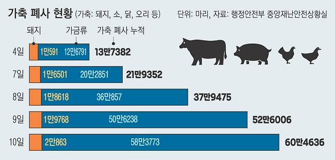 행정안전부 통계를 보면 올해 5월20일부터 지난 10일까지 폐사한 가축은 총 60만4636마리로 집계됐다. 지난해 같은 기간(5만3238마리)의 약 11배 규모다. 최근 하루 가축 폐사 규모는 8만마리에 육박할 정도로 증가 속도가 가파르다. 가축 폐사 피해는 상대적으로 더위에 취약한 닭과 오리를 키우거나 냉방·환기시설이 미흡한 농가일수록 크다.