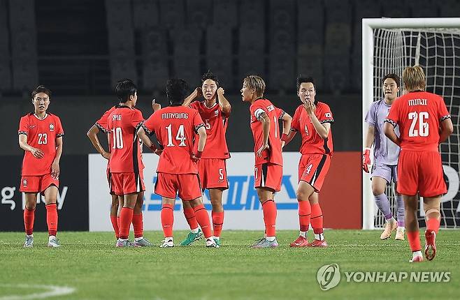 (화성=연합뉴스) 김성민 기자 = 13일 경기도 화성종합경기타운 주경기장에서 열린 2025년 동아시아축구연맹(EAFF) E-1 챔피언십(동아시안컵) 여자부 대한민국과 일본의 경기. 한국 선수들이 선제골을 내준 후 아쉬워하고 있다. 2025.7.13