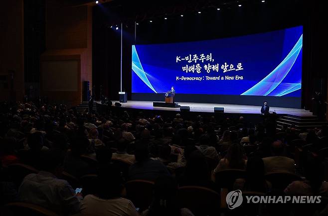 (서울=연합뉴스) 홍해인 기자 = 이재명 대통령이 13일 서울 강남구 코엑스에서 열린 2025 세계정치학회(IPSA) 서울총회 개막식에서 연설하고 있다. 2025.7.13 [대통령실통신사진기자단]