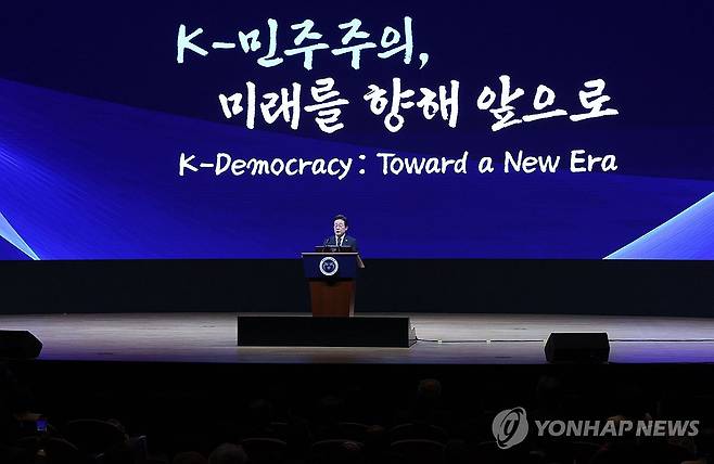 (서울=연합뉴스) 홍해인 기자 = 이재명 대통령이 13일 서울 강남구 코엑스에서 열린 2025 세계정치학회(IPSA) 서울총회 개막식에서 연설하고 있다. 2025.7.13 [대통령실통신사진기자단]