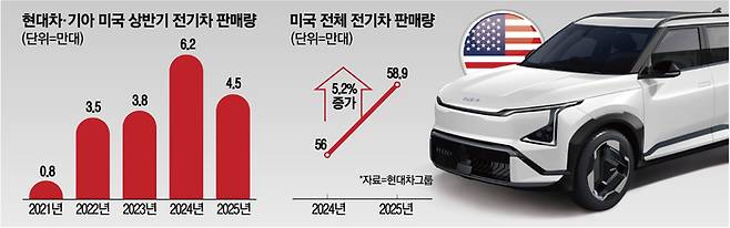 미국 시장에서 현대차그룹 전기차 판매 부진은 통계로도 드러난다. 현대차·기아가 올 상반기 미국에서 판매한 전기차는 4만4555대로 작년 동기보다 28.0% 감소한 것으로 나타났다. 현대차는 4.6% 감소한 3만988대, 기아는 무려 53.8% 급감한 1만3567대로 집계됐다. 같은 기간 미국 내 전기차 총판매량이 56만198대에서 58만966대로 5.2% 증가했지만, 판매량은 오히려 뒷걸음질을 친 셈이다.