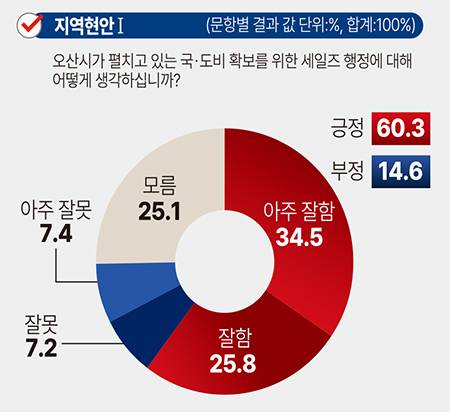 13일 중부일보 의뢰로 여론조사기관 데일리리서치가 오산시 거주 만 18세 이상 남녀 500명을 대상으로 지난 8일부터 10일까지 사흘간 실시한 여론조사 결과(95% 신뢰수준에 오차범위 ±4.4%p)에 따르면 '오산시가 국·도비 확보를 위한 세일즈 행정을 펼치는 것에 대해 어떻게 생각하나'는 물음에 응답자 60.3%가 긍정적으로 답했다.