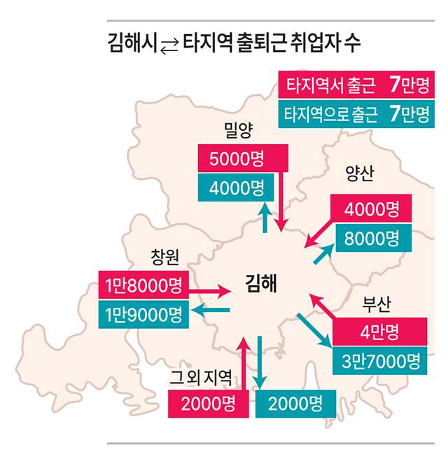 김해시로 통근하는 타 지역 거주자는 부산 57.1%(4만 명), 창원 26.4%(1만8000명), 밀양 7.6%(5000명) 순으로 높게 나타났다.