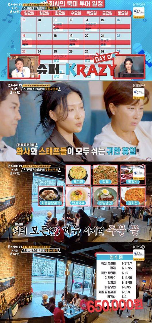 그렇게 화사는 스태프들을 위해 꽃갈비 6인분, 잡채, 계란찜, 김치전, 비빔냉면, 잔치국수, 차돌된장찌개, 공기밥까지 거침없이 주문했다. 매니저는 익숙한 듯 작성한 메모장을 넘겼고, 화사는 총 65만 원 플렉스를 해 감탄을 자아냈다.
