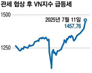 그러나 관세 협상이 타결된 이후 분위기가 반전됐다는 평가다. JP모건은 협상 결과가 발표된 이후 베트남 증시에 대한 ‘비중 확대’ 의견을 제시했다. 뷔 코이 JP모건 연구원은 “2분기 국내총생산(GDP) 상승률 전망치가 8%에 달하는 등 강력한 경제 성장과 맞물려 아세안에서 베트남 주식에 대한 비중을 확대한다”며 “VN지수의 연말 목표치를 1500~1600로 제시한다”고 밝혔다.