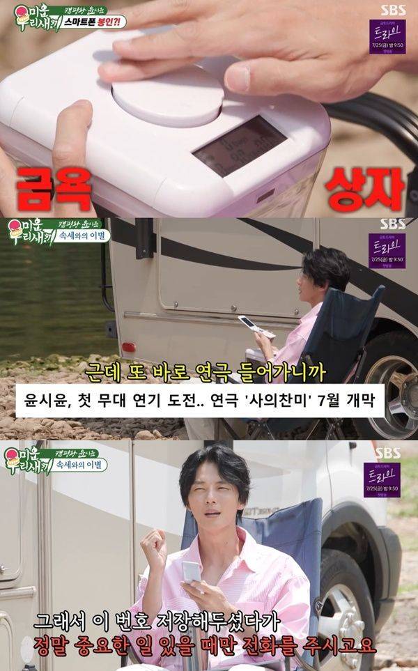 이후 주머니에서 옛날 휴대폰을 꺼내더니 회사 관계자에게 전화를 걸었다. 윤시윤은 "속세를 차단하려고 캠핑 왔다"고 말했다.