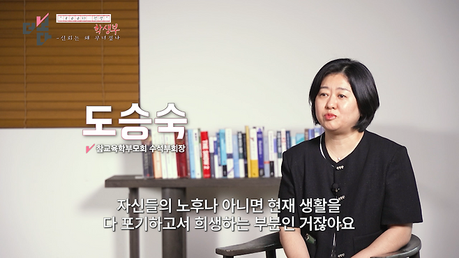 중학교만 돼도 엄마들이 아르바이트하러 다 나가시잖아요. 아이 둘이면 벌써 지금 300만 원 돈이 들어가는 상황인데. 자신들의 노후나 아니면 현재 생활을 다 포기하고서는 희생하는 부분인 거잖아요. 이건 짐 정도가 아니라 ‘기둥을 흔들고 있다’는 생각이 들고요.