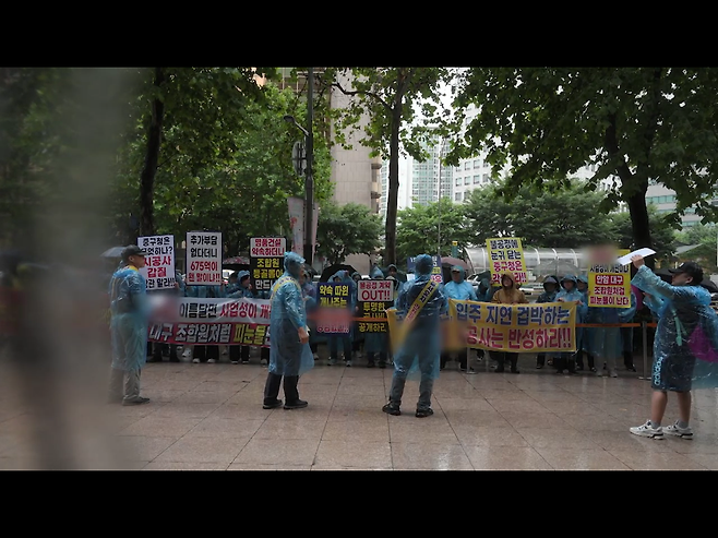 굵은 빗줄기 사이로 대형 버스가 멈춰 섭니다. 우비를 입은 사람들이 차례대로 내리더니, 순식간에 손팻말 앞으로 모여섭니다.