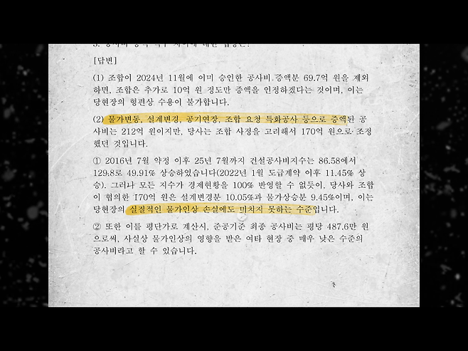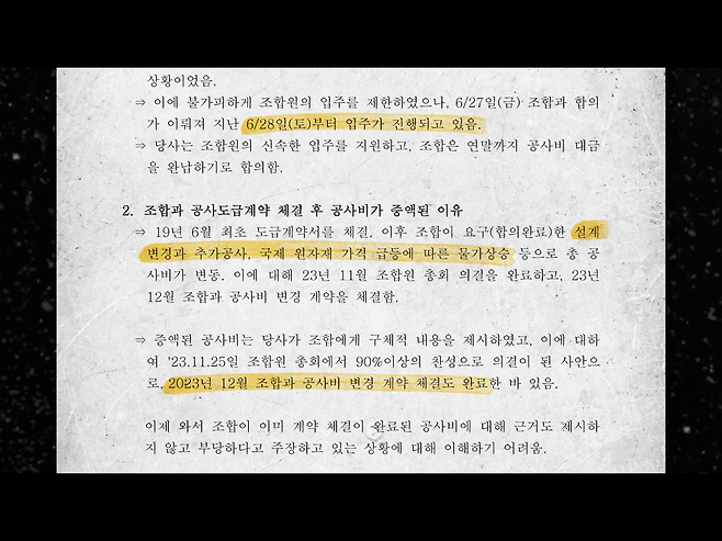 시공사 측은 입주 지연은 조합과의 합의로 해결됐으며, 공사비 증액은 설계변경과 물가 급등 등에 따른 것이라고 설명했습니다. 또, 2023년 변경 계약이 끝난 공사비에 대해 이제 와 문제를 제기하는 건 이해하기 어렵다고 전했습니다.