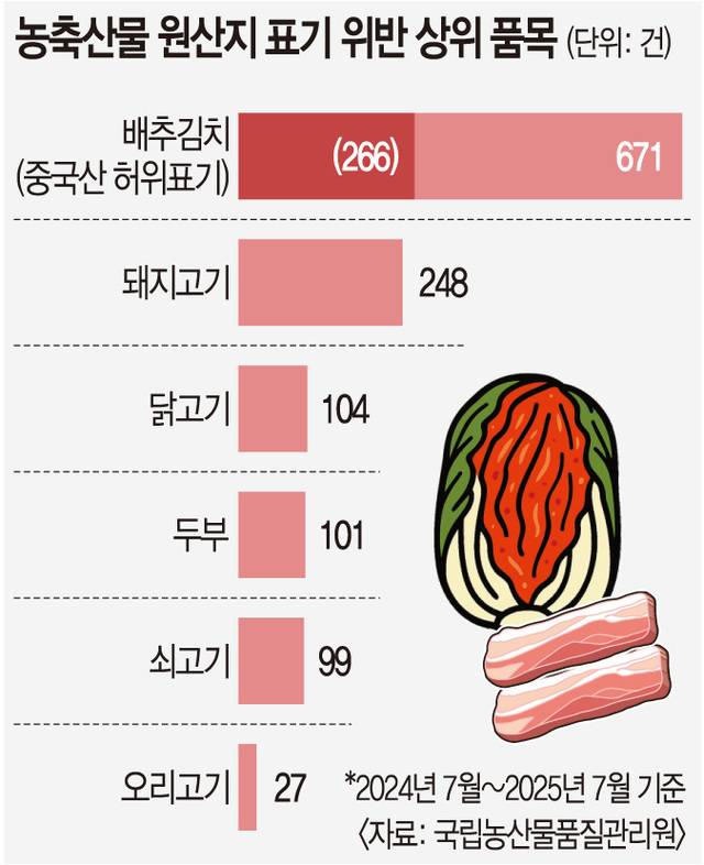 국민일보가 13일 최근 1년간(2024년 7월~2025년 7월) 농림축산식품부 소속기관 국립농산물품질관리원의 원산지 표시 위반 공표 자료를 분석한 결과 총 1692건 위반 사례 중 배추김치를 포함한 건은 671건으로 전체의 약 40%를 차지해 최다였다.