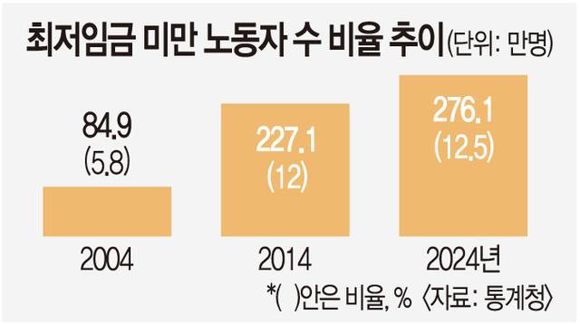 임금은 지속적으로 오르지만 실질적인 개선을 체감하기는 어렵다는 것도 문제다. 통계청에 따르면 최저임금 미만 노동자 비율은 2004년 5.8%에서 지난해 12.5%로 두 배 넘게 증가했다. 이중 지난해 숙박·음식점업 비율은 33.9%로 가장 높다.