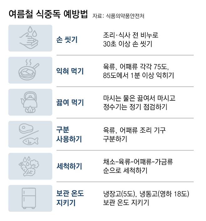 폭염이 일찍 찾아온 올해는 5월부터 식중독 사례가 늘고 있어 개인과 지자체가 보다 적극적으로 식중독 예방에 나서야 한다는 지적이 나온다. 최준용 세브란스병원 감염내과 교수는 “고온 환경에서는 음식물 내 미생물 증식과 독소 생성이 활발해져 식중독 발생 가능성이 커진다”며 “(여름철에) 음식점이나 급식 시설에 대한 위생 점검을 강화해 식중독 의심 사례가 생길 시 신속한 역학조사를 하는 게 중요하다”고 말했다.
