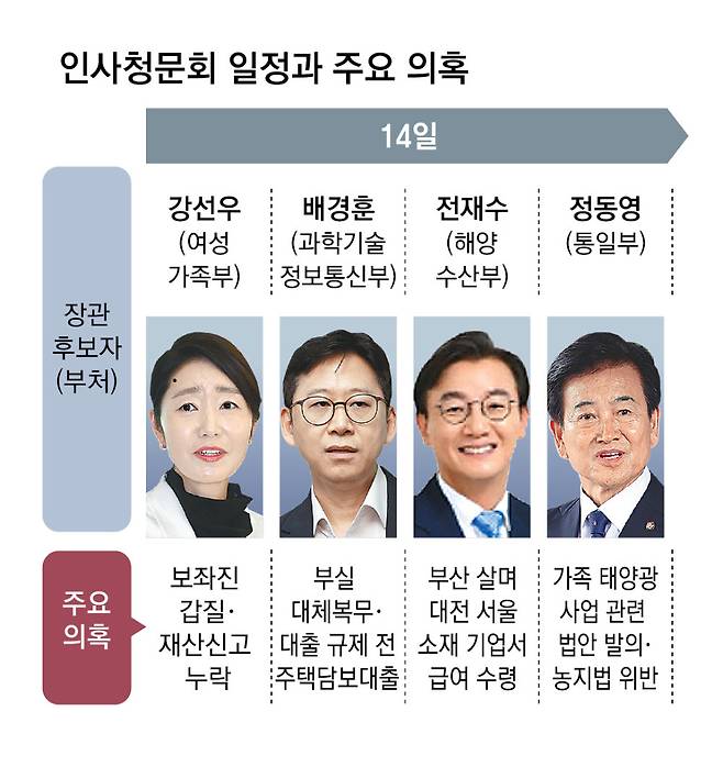 14일부터 5일간 진행되는 이재명 정부 초대 장관 후보자 청문회의 최대 전장(戰場)은 강선우 여성가족부 장관 후보자와 이진숙 부총리 겸 교육부 장관 후보자의 청문회가 될 것으로 전망된다. 야당인 국민의힘이 강 후보자의 ‘보좌진 갑질 의혹’과 이 후보자의 ‘제자 논문 표절 의혹’ 등에 공세를 예고한 가운데 두 후보자는 의혹에 대한 반박에 나서며 정면 돌파를 예고했다. 여당인 더불어민주당 내에서도 청문회 소명 이후에 판단하겠다는 신중론이 힘을 받고 있어 청문회에서 해명이 충분하지 못했다는 판단이 내려지만 이재명 정부 내각의 첫 낙마 사례가 나올 수 있다는 관측이 제기된다.