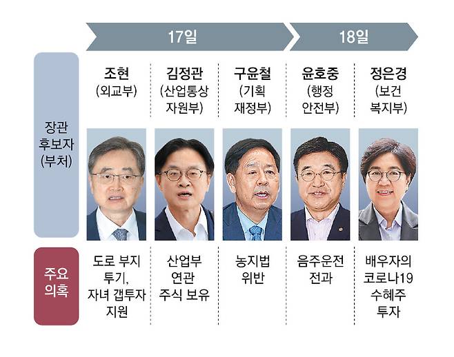 두 후보자 외에 정동영(통일부) 정은경(보건복지부) 한성숙(중소벤처기업부) 장관 후보자 등에 대해서도 야당은 송곳 검증을 벼르고 있다. 정동영 후보자는 가족이 태양광 사업을 하는 가운데 혜택이 될 수 있는 관련 법안을 발의했다는 의혹과 농지를 가지고도 농사를 짓지 않았다는 농지법 위반 의혹 등을 받고 있다. 한 후보자는 모친과 동생 등 가족에게 편법증여를 했다는 의혹을 받고 있으며, 정은경 후보자는 코로나19 방역을 담당할 당시 배우자가 코로나19 수혜주에 투자했다는 의혹이 불거졌다.