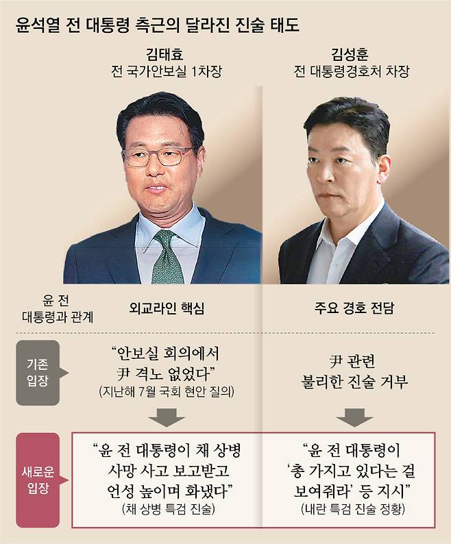 윤석열 정부의 실세 참모로 외교안보 정책을 주도한 김 전 1차장은 최근 채 상병 특검 조사에서 ‘VIP 격노설’에 대해 직접 목격했다며 기존 입장과 다른 진술을 한 것으로 전해졌다. 김 전 1차장은 11일 특검 조사에서 “윤 전 대통령이 임기훈 전 대통령실 국방비서관으로부터 1장짜리 채 상병 사망 사고 보고를 받았고, 직후 언성을 높이며 화를 냈다”는 취지로 진술했다고 한다. VIP 격노설이란 윤 전 대통령이 2023년 채모 상병 순직 사건을 경찰에 이첩해야 한다는 해병대 수사단 보고에 격노하면서 이첩 보류를 지시했고 조사 결과를 바꾸게 했다는 의혹이다.