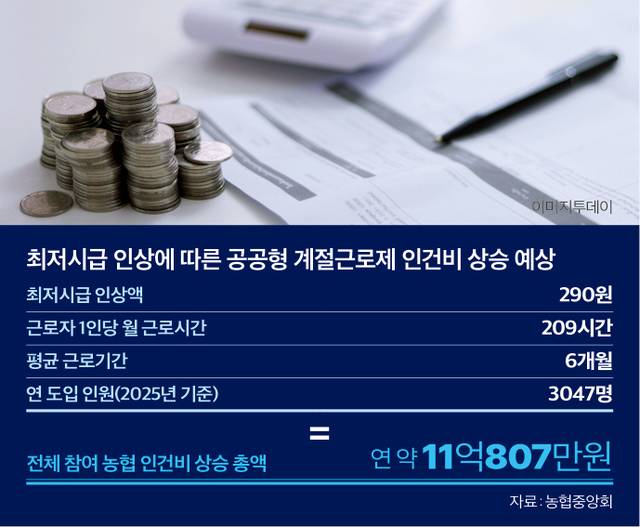 참여 농협들은 당장 내년도 최저임금을 예의주시하고 있다. 2026년 최저시급은 올해(1만30원)보다 290원 오른 1만320원으로 10일 결정됐다. 계절근로자 1명의 월 소정 근로시간이 209시간임을 고려하면 근로자 한사람당 월 급여액 부담은 6만610원 늘어난다. 공공형 계절근로자의 근무기간을 평균 6개월로 잡으면, 36만3660원이 인상되는 셈이다. 올해 전국 90개 농협이 도입한 계절근로자는 3047명으로, 최저시급 인상으로만 연간 약 11억원의 인건비 부담액이 증가한다.