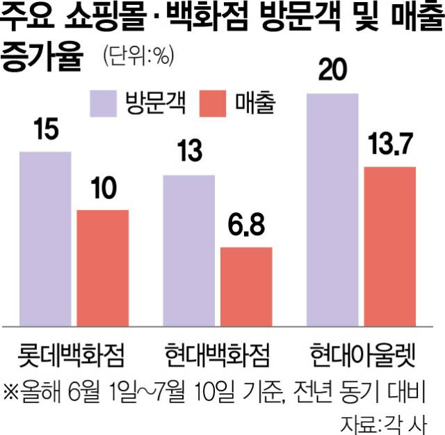 현대아울렛도 같은 기간 매출이 13.7% 증가했고, 방문객 수는 약 20% 뛰었다. 현대백화점 관계자는 “7월 들어 폭염이 이어지면서 무더위를 피해 백화점과 아울렛 등 실내 쇼핑 공간을 찾는 고객이 늘고 있다”며 “패션·스포츠·잡화 등 여름 관련 상품을 중심으로 쇼핑 수요가 크게 증가하는 추세”라고 전했다.