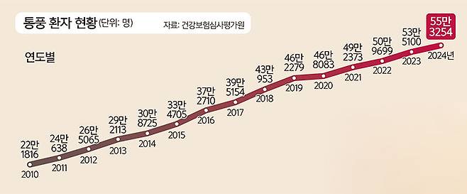 통풍은 그동안 중장년층의 질병으로 여겨졌지만, 최근에는 육류와 주류 섭취, 비만·대사증후군 증가 등의 영향으로 20∼30대 환자가 빠르게 증가하고 있다. 특히 여름철이면 통풍 환자가 20% 이상 증가하는 만큼 주의가 필요하다.