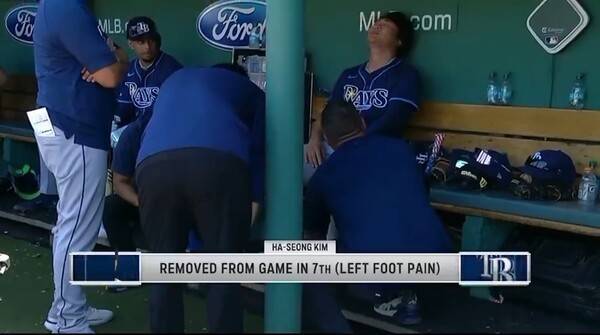 김하성은 타석에 남았으나 9구 만에 삼진으로 물러난 후 7회 말 수비에서 교체됐다. 2루수 테일러 월스가 유격수로 이동하고 커티스 미드가 2루에 투입됐다. 케빈 캐시 탬파베이 감독과 트레이너가 부상 정도를 확인하는 모습이 카메라에 잡혔다. 고통을 호소하는 김하성의 모습이 보였다.