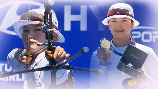 한국 양궁 대표팀의 강채영 선수가 월드컵 4차 대회에서 여자 단체전과 개인전 정상에 올라 2관왕을 차지했습니다.