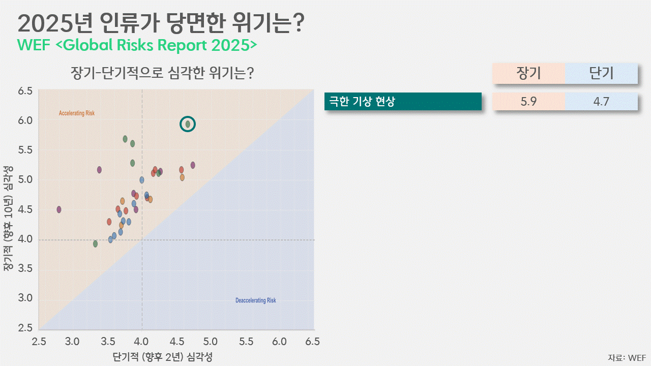 홍수나 폭염 등 극한 기상 현상은 장기적(향후 10년)으로나, 단기적(향후 2년)으로나 '가장 심각한 위기'로 꼽혔습니다. WEF(World Economic Forum, 세계경제포럼)가 해마다 내놓는 〈글로벌 위기 보고서〉에 담긴 결과입니다. 이는 장기적 및 단기적으로 위기별 심각성을 1~7점 척도로 매겨 전 세계의 사회 각계각층을 상대로 조사한 것으로, 극한 기상 현상은 장기 5.9점, 단기 4.7점으로 다른 모든 위기를 넘어설 만큼 심각한 위기라고 세계인의 중지가 모였습니다. 극한 기상 현상에 이어 가장 위기로 꼽힌 것은 오정보(Misinformation)와 허위정보(Disinformation)로, 장기 심각성은 5.2점, 단기 심각성은 극한 기상 현상만큼 심각한 4.7점으로 평가됐습니다.