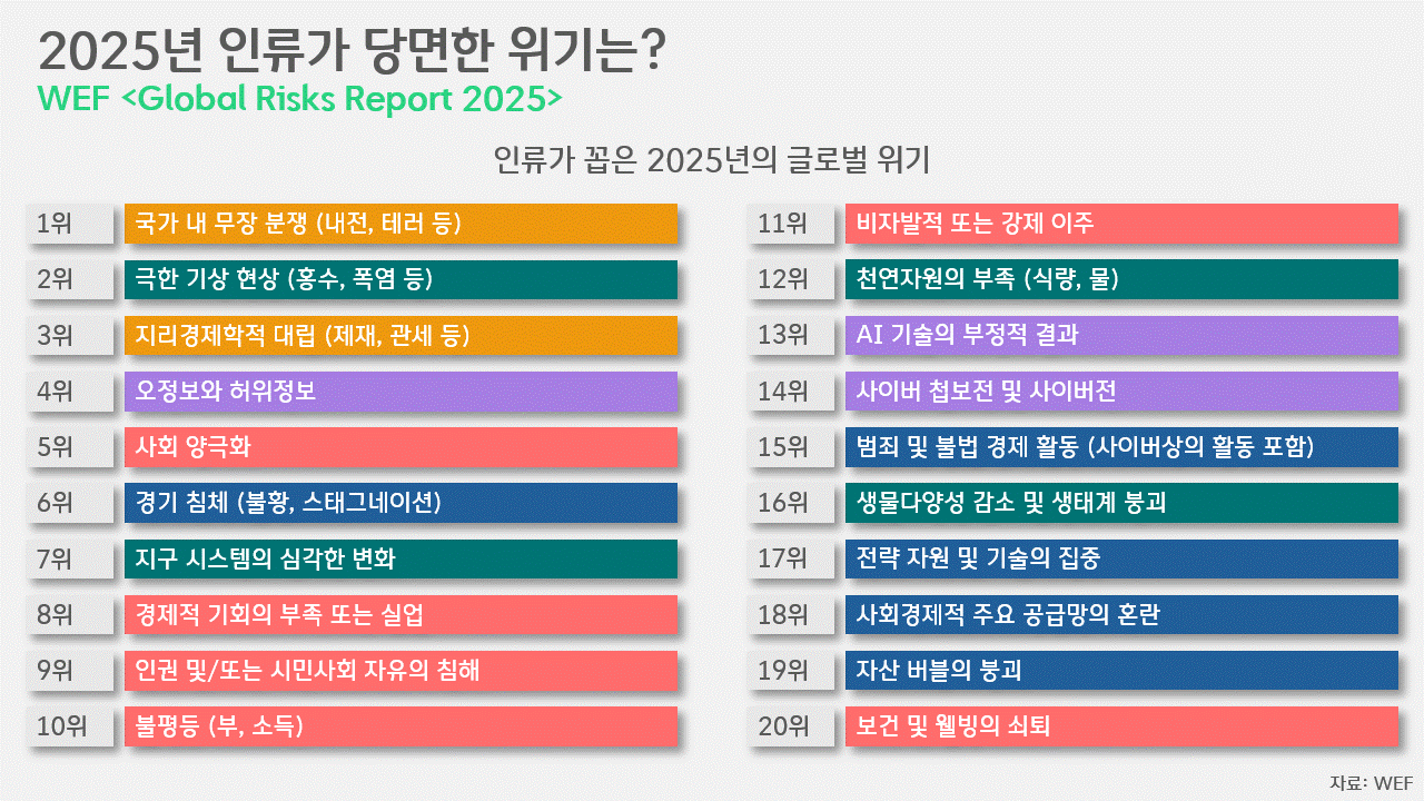 이들 위기의 심각성에 대한 우선순위는 시민사회나 학계, 재계에 따라 조금씩 달랐습니다. 시민사회는 4가지 환경 위기에 대해 높은 우선순위를 부여했습니다. 극한 기상 현상은 2위, 지구 시스템의 심각한 변화는 3위, 생물다양성 손실 및 생태계 붕괴는 8위, 천연자원 부족은 9위에 올랐죠. 학계에서도 극한 기상 현상을 무장 분쟁에 이어 두 번째로 심각한 2025년의 위기로 꼽았습니다. 하지만 지구 시스템의 심각한 변화는 5위, 천연자원 부족은 9위, 생물다양성 손실 및 생태계 붕괴는 13위로 달랐습니다. 재계 또한 극한 기상 현상이 당장의 심각한 위기(3위)라고 판단했습니다. 다만 극한 기상 현상 외에도 기후변화로 인한 지구 시스템의 심각한 변화는 7위로 우선순위가 더 내려왔죠. 다른 모집단 대비 경제적, 사회적 위기에 더 민감한 만큼, 상위 20위 가운데 환경과 관련한 위기는 이 두 가지뿐이었습니다.