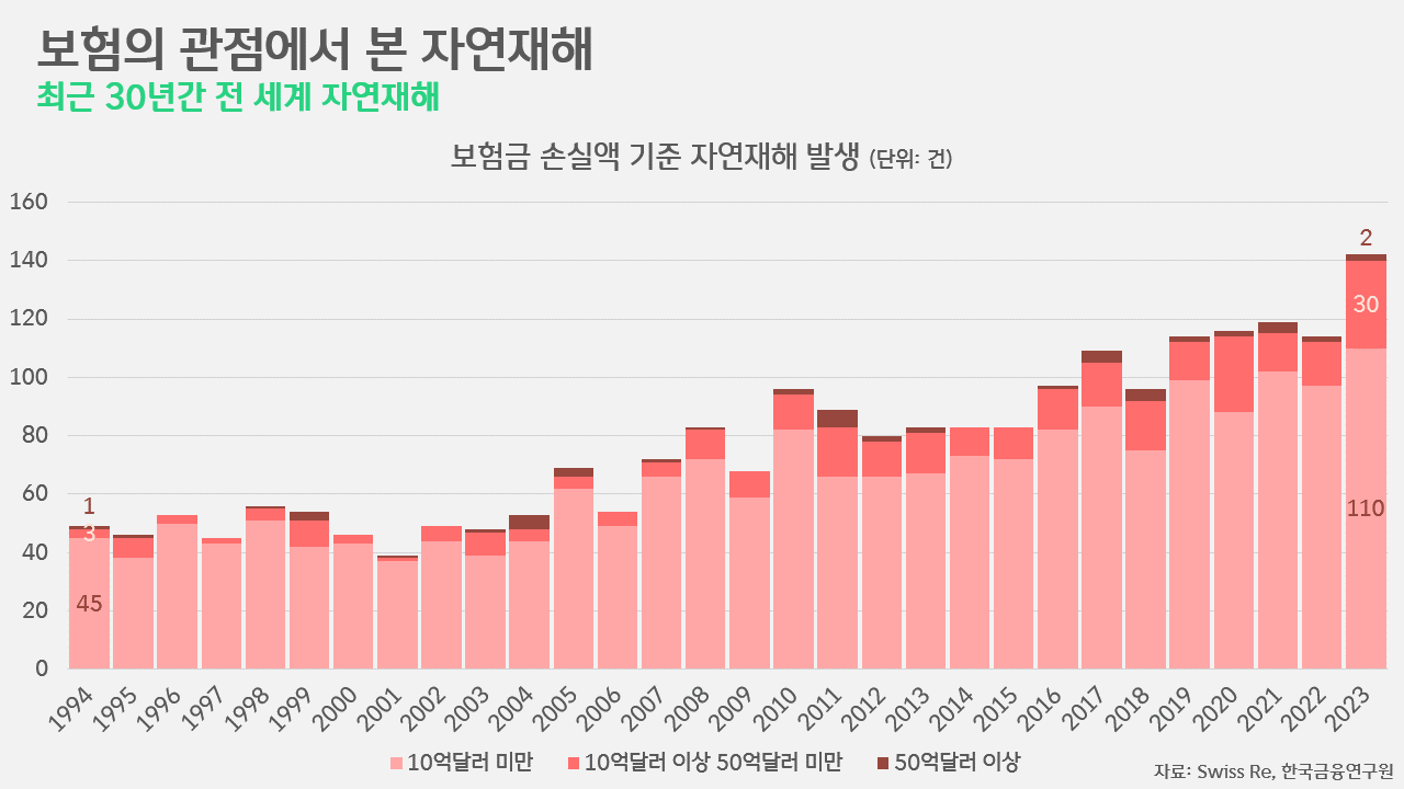 시민사회나 학계, 재계 나눌 것 없이, 극한 기상 현상을 가장 큰 당면 위기로 여기는 이유는 위의 통계로도 알 수 있습니다. 전 세계의 자연재해 발생 건수를 '보험금 손실액' 기준으로 살펴본 결과, 손실액 10억달러 미만의 자연재해는 연평균 3.5%, 10억달러 이상 50억달러 미만의 자연재해는 연평균 무려 7.5% 늘어났기 때문입니다. 그저 “왜 이렇게 덥냐”, “왜 이렇게 비가 갑자기 오냐” 투덜대는 수준을 넘어, 금전적으로 그 피해를 보상해줘야 할 만큼 우리의 주변 환경은 위태로워진 것이죠. 전체 건수로만 따져봐도, 1994년 총 49건이었던 '대규모 보상이 필요한 자연재해'는 30년이 지난 2023년 142건으로 3배가 됐습니다.