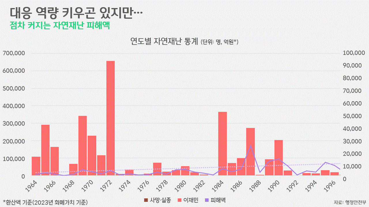 우리나라는 어떨까. 1964년부터 60년간의 통계를 살펴봤습니다. 새마을 운동이 시작되기 한참 전부터의 통계인 만큼, 이런 장기적 관점으로 봤을 때, 인명피해는 감소한 반면, 피해액은 늘어나는 경향을 보였습니다. 오랜 기간, 사회적으로, 경제적으로 성장하며 우리의 재난 대응 체계가 고도화됐고, 더욱 빠르게 예방하고, 신속히 사후 대처에 나선 결과입니다. 그런데, 이런 노력은 우리가 마주하는 환경이 심각하게 빠른 속도로 악화하고 있다는 현실을 체감하지 못 하게 만들기도 했습니다. 여전히 기후변화라고 하면 '북극곰'을 떠올리거나, 그래도 조금 나아가 투발루와 같은 '바다에 잠겨 사라지고 있는 국가'를 떠올릴 뿐, 우리 스스로의 위기라고는 여기지 않는 경우가 많은 이유입니다.