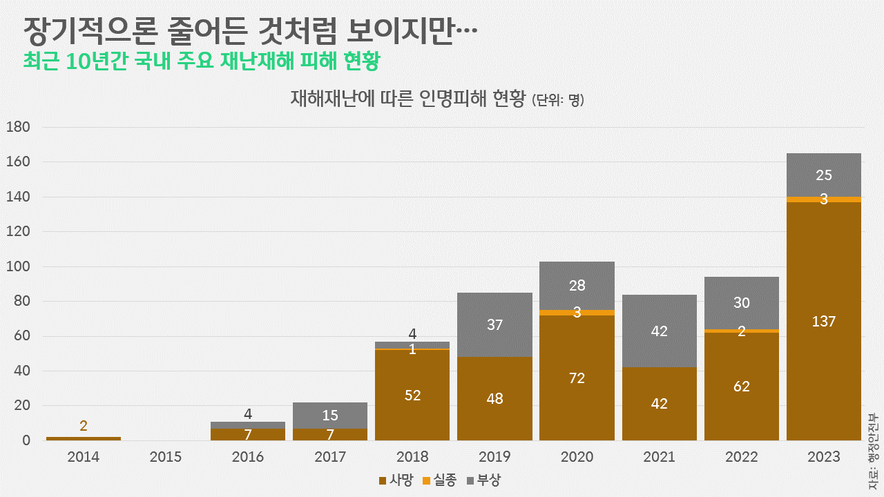 하지만, 더는 우리의 대응 역량만으론 감당하기 어려울 정도로 상황은 악화했습니다. 이는 '최근 10년'으로 통계의 스코프를 좁혀보기만 해도 드러납니다. 2014년 2명이었던 재해재난 인명피해 규모는 지난 2023년 기준 165명으로 급증했습니다. 최근 10년간 발생한 212건의 우심피해 가운데 가장 많은 비중을 차지한 것은 60.8%의 호우(129건)였습니다. 이어 태풍(64건), 냉해·동해(9건) 순이었고요. 이러한 212건의 우심피해로 발생한 경제적 피해규모는 무려 3.3조원에 달합니다. 가장 많이 발생했던 것이 호우인 만큼, 피해액 또한 2조 1,606억원을 넘으며 우리에게 금전적으로도 가장 큰 피해를 안겼습니다. 이어 태풍(9,218.8조원), 냉해·동해(486.6억원), 대설(312.5억원) 순으로 피해액이 집계됐습니다. 지진의 경우, 10년간 단 2건의 우심피해를 안겼지만, 피해액은 938.6억원으로 냉해나 동해, 대설로 인한 피해액을 합친 것보다 더 많았습니다.