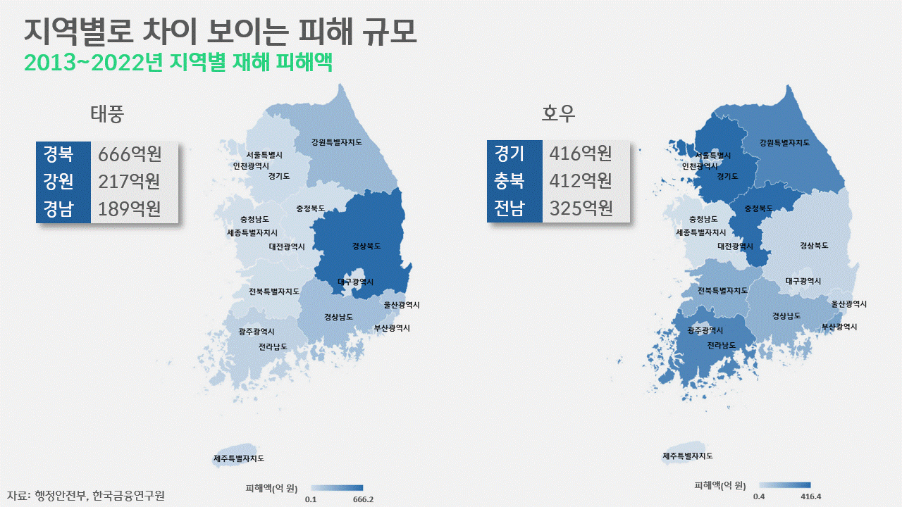 호우의 경우는 피해의 집중 지역이 조금 달랐습니다. 경기도가 416억원으로 10년간 피해액이 가장 컸고, 충청북도는 412억원, 전라남도는 325억원으로 그 뒤를 이었습니다. 태풍 대비 지역별 편차는 적은 편이나, 대체로 중부내륙이나 전남 등 서쪽지역에 집중됐죠. 이들 지역은 편서풍으로 바다를 건너오는 비구름대를 먼저 맞닥뜨리는 곳으로, 인구나 시설도 밀집돼 재해 피해액은 커질 수밖에 없습니다.