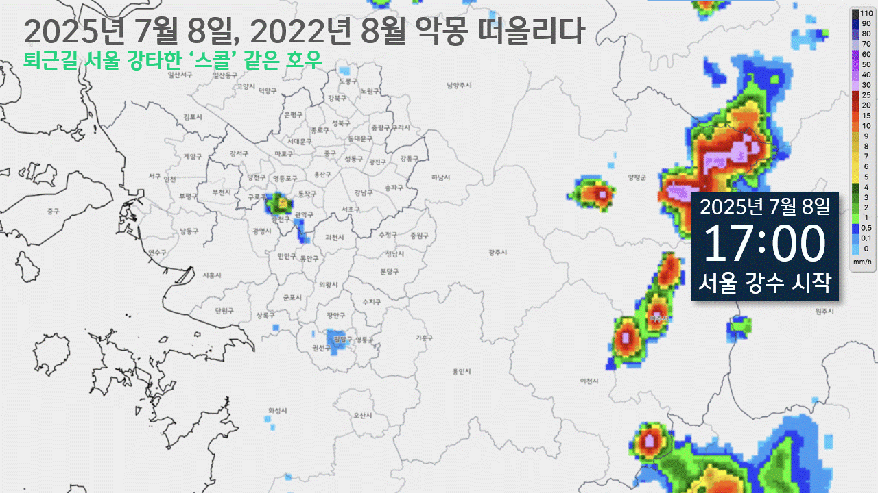 지난 8일, 서울의 공식 일 최고기온은 37.8℃에 달했습니다. 1907년 10월부터 시작된 서울의 기상관측 이래, 7월 초순 중 가자 높은 기록입니다. 당초 7월 초순 역대 일 최고기온 1위 기록은 1939년 7월 9일이 거머쥐고 있었는데, 86년 만에 이 기록이 깨진 겁니다. 7월 전체의 역대 일 최고기온 기록으로 보더라도, 이는 1994년 7월 24일의 38.4℃, 2018년 7월 31일의 38.3℃, 1994년 7월 23일의 38.2℃, 2018년 7월 22일의 38℃에 이어 5위에 오를 정도였습니다. 그런데, 이렇게 '역대급 폭염'이 찾아온 날, 서울엔 2022년의 악몽을 떠올릴 법한 폭우가 쏟아졌습니다. 퇴근시간 무렵, 시간당 최대 130mm급에 달하는 비가 퍼부어진 겁니다.