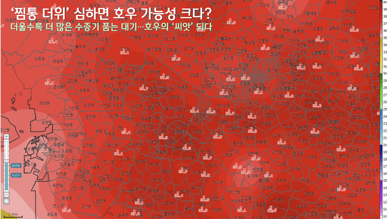 '시간당 100mm급'이라는 표현에서 엿볼 수 있듯, 다행히 이정도 강도의 비가 1시간 넘게 이어지진 않았습니다. 덕분에 이날 서울의 공식 강수량은 11.8mm에 그쳤고, 상대적으로 비가 집중됐던 서남권조차 일 강수량은 81mm 안팎에 그쳤습니다. 그러나 모두가 한낮 폭염에 깜짝 놀란 채 퇴근길을 서두르던 시각, 갑작스레 하늘에 구멍이라도 뚫린 듯 쏟아진 비에 충격을 받았습니다. 그런데, 왜 서남권이었을까요. 첫 번째 비밀은 온도에 있습니다. 서울의 공식 일 최고기온이 37.8℃로 기록됐던 이날, 서남권은 39℃ 안팎까지 기온이 치솟았습니다. 서울에서도 유독 기온이 높았던 것이죠. 이렇게 달궈진 땅과 대기는 동남아 스콜과 같은 호우의 씨앗이 됩니다.