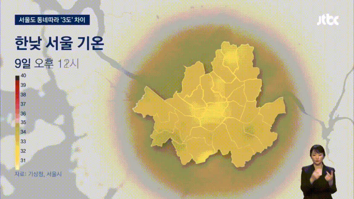 그런데, 서남권이 유독 다른 곳들보다 달궈진 것은 이번이 처음이 아닙니다. 9~10일에도 서울의 기온은 마찬가지의 양상을 보였습니다. 9일 오후 4시, 종로구와 서대문구의 기온이 34℃ 안팎에 머물렀던 당시, 서남권의 기온은 37℃ 안팎까지 올랐습니다. 해가 지고, 열기가 식어가는 과정에서도 이 차이는 이어졌습니다. 서남권 대부분과 잠실 인근의 기온은 새벽 1시까지도 30℃를 훌쩍 넘었고, 서남권 일부는 새벽 3시까지도 30℃ 이상인 곳도 있었습니다.