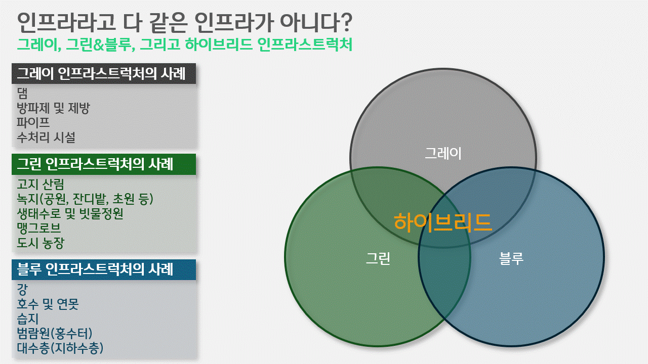 자연으로부터 최대의 편익을 끌어내기 위한 이러한 노력은 일부 생태주의자들에겐 불편하게 느껴질 수도 있습니다. 하지만 기후변화로 우리가 겪게 된 재해재난은 과거의 통계에 기반해 그 한계가 설계된 그레이 인프라만으론 막을 수 없습니다. 그렇다고 평시엔 흉물스러운 구조물의 모습에 온갖 민원의 근원이 될 그레이 인프라를 과잉 구축할 수도 없는 노릇입니다. 이는 인공적, 인위적인 구조물로 막을 수 있다는 기존의 관습적 대응을 전면적으로 재검토해야만 가능한 일입니다. 유례없는 수준의 재해재난에 대응함과 동시에 사회 인프라와의 연결성을 높이고, 재해 후의 회복성 또한 강화시키며, 평시엔 다양한 생태계 서비스를 제공하고, 주민들의 다양한 니즈를 충족시키는 것, 하이브리드 인프라에 지금부터라도 정부와 시민사회 모두가 관심 갖고 집중해야만 하는 이유입니다.