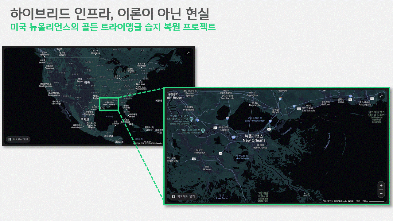 하이브리드 인프라는 그저 연구논문에만 존재하는 개념도가 아닙니다. 미국 뉴올리언스의 골든 트라이앵글 프로젝트는 대표적인 하이브리드 인프라의 사례입니다. 예로부터 호우나 허리케인 등으로 민물, 바닷물 가릴 것 없이 침수 피해가 잇따랐던 뉴올리언스는 기존의 그레이 인프라 중심의 대응을 넘어 그린 및 블루 인프라와의 접목을 통한 새로운 대응에 나섰습니다.
