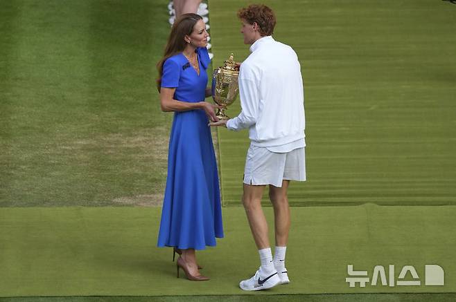 [런던=AP/뉴시스] 얀니크 신네르(1위·이탈리아)가 13일(현지 시간) 영국 런던 올잉글랜드 클럽에서 열린 2025 윔블던 테니스 대회 남자 단식 정상에 올라 케이트 미들턴 영국 왕세자빈으로부터 트로피를 받고 있다. 신네르는 결승에서 3연패를 노리는 카를로스 알카라스(2위·스페인)에게 3-1(4-6 6-4 6-4 6-4) 역전승을 거두고 윔블던 첫 우승을 차지했다. 2025.07.14.