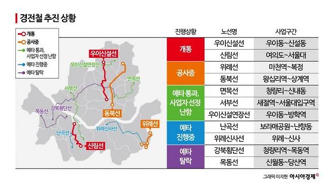 이 중 강북횡단선과 목동선은 지난해 기획재정부의 예비타당성 조사 문턱을 못 넘어 탈락했다. 난곡선은 예타 절차가 진행 중이지만 수익성 미달로 통과 가능성이 낮다는 관측이 나온다. 면목선은 예타 문턱을 넘었지만 사업자를 구하지 못해 사업이 앞으로 나가지 못하고 있다.