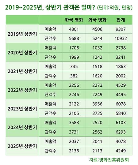 4249만명. 영화진흥위원회 영화관입장권 통합전산망이 집계한 2025년 상반기 누적 관객수다. 코로나19 사회적 거리두기가 해제된 게 2022년 4월18일인데, 올해 상반기 관객수는 2022년 상반기(4495만명)보다 적다. 지난해 상반기 관객 6293만명에서 2000만명 이상 줄어들었다.