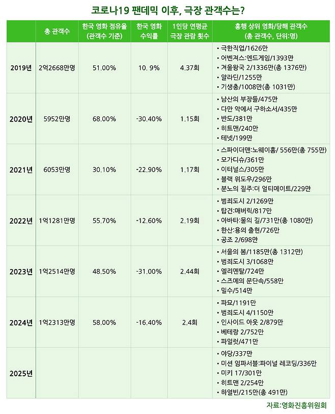 코로나19 직전인 2019년은 한국 극장가의 정점이었다. 2013년에 총 관객수 2억명을 돌파했는데, 2019년에는 총 관객수 2억2668만명을 기록했다. 영화진흥위원회의 보고서(2024년 한국 영화산업 결산)에 따르면, 2019년의 1인당 극장 관람 횟수가 4.37회로 세계 최고 수준이었다. ‘한국 영화산업 규모에 비해 너무 많은 영화가 제작되고 있다’는 말이 영화계에서 나올 정도였다. 2020년 2월 아카데미 영화제 4개 부문을 수상한 봉준호 감독의 영화 〈기생충〉이 개봉한 것도 2019년이다.