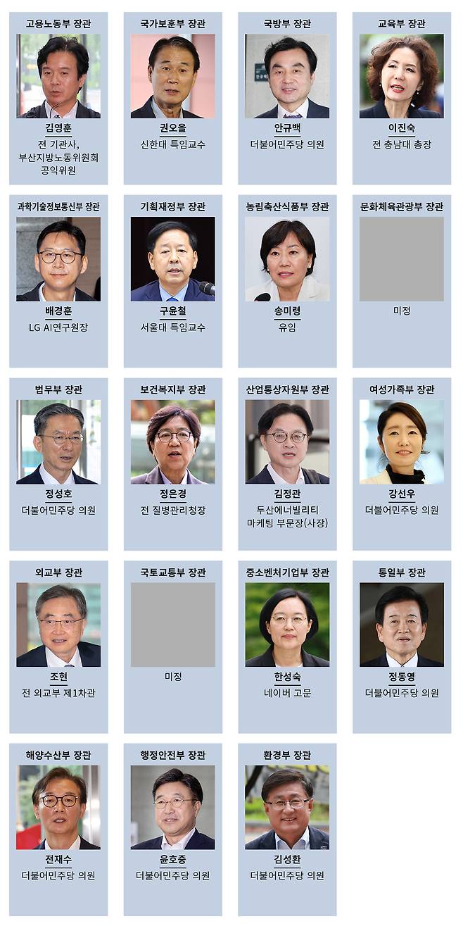이 대통령은 전체 19곳 정부 부처 가운데 17곳의 장관 후보자 인선을 발표했다(7월3일 기준, 〈사진〉 참조). 6월23일 국방부 장관에 안규백 더불어민주당 의원, 외교부 장관에 조현 전 외교부 제1차관, 통일부 장관에 정동영 더불어민주당 의원 등 총 10명을 지명했다. 윤석열 정부가 임명한 송미령 농림축산식품부 장관은 유임시키기로 했다. 6월29일에는 기획재정부 장관에 구윤철 서울대 경제학부 특임교수, 교육부 장관에 이진숙 전 충남대학교 총장, 법무부 장관에 정성호 더불어민주당 의원, 보건복지부 장관에 정은경 전 질병관리청장, 산업통상자원부 장관에 김정관 두산에너빌리티 마케팅 부문장(사장), 행정안전부 장관에 윤호중 더불어민주당 의원을 지명했다.