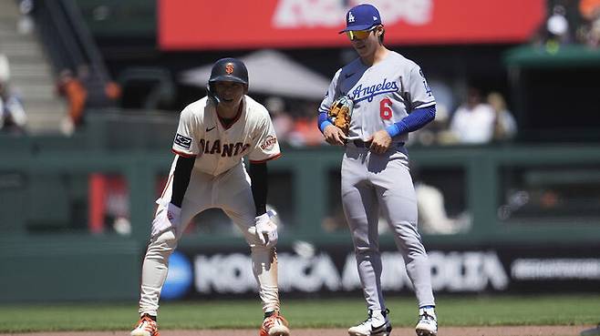 ▲ 2루타를 치고 나간 샌프란시스코 이정후(왼쪽)와 다저스 2루수 김혜성