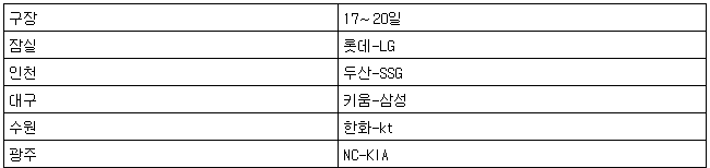 이에 따라 롯데 자이언츠-LG 트윈스(잠실), 두산 베어스-SSG 랜더스(인천), 키움 히어로즈-삼성 라이온즈(대구), 한화 이글스-kt wiz(수원), NC 다이노스-KIA 타이거즈(광주)가 17일부터 20일까지 네 차례 격돌한다.