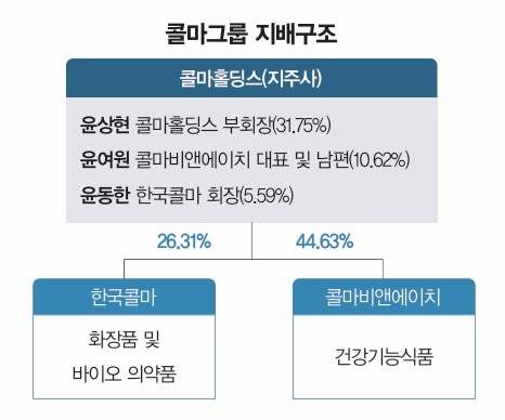 콜마그룹은 화장품 제조자개발생산(ODM) 업체로 코스맥스과 함께 K-뷰티 제조 분야를 이끌고 있다. 콜마그룹이 2세대 경영체제로 전환한 것은 2019년 일본과의 무역 갈등 당시 윤동한 회장이 정부 대응에 막말을 하는 영상이 공개되며 경영 일선에서 물러나면서다. 윤 회장은 아들에게는 화장품·의약품 사업을, 딸에게는 건강기능식품 사업을 맡겼다. 그러면서 자신이 갖고 있던 지주사 콜마홀딩스 주식을 아들(31.75%), 딸과 사위(10.62%)에게 증여했다. 콜마홀딩스가 자회사 콜마비앤에이치 지분을 44.63% 갖고 있어 윤상현 부회장이 그룹을 지배할 수 있는 구조다(표 참조).콜마그룹 내 분쟁은 4월 25일 윤상현 부회장이 자신과 이승화 전 CJ제일제당 부사장을 자회사 콜마비앤에이치 사내이사로 선임하려고 하면서 시작됐다. 콜마비앤에이치 실적이 부진하자 이사회에 들어가 경영에 직접 관여하겠다고 한 것이다. 윤 부회장의 여동생인 윤여원 콜마비앤에이치 대표는 "경영권을 흔드는 행위"라고 반발하며 사내이사 임명을 거부했다. 윤 부회장은 5월 2일 이사회 개편을 위한 임시주주총회를 열 수 있게 해달라며 소송을 냈다. 이에 맞서 윤 대표는 위법 행위 중지 가처분신청을 했다.