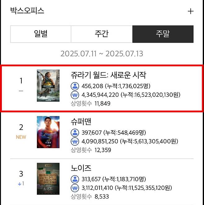 한편, 13일 박스오피스에서는 '쥬라기 월드'에 이어 '슈퍼맨'이 141,174명의 관객을 모으며 일일 박스오피스 2위를 차지했다. 그 뒤로 '노이즈'(119,922명), 'F1 더 무비'(106,177명), '드래곤 길들이기'(18,442명)가 박스오피스 상위권에 이름을 올렸다.