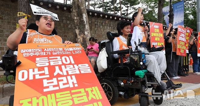 [서울=뉴시스] 추상철 기자 = 전국장애인차별철폐연대가 14일 오전 서울 종로구 경국정기획위원회 앞에서 선전전을 열고 '장애등급제 폐지' 등을 촉구하고 있다. 2025.07.14. scchoo@newsis.com